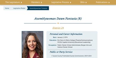 The Dawn Fantasia webpage provides information about her legislative role, committee assignments, contact information, and service representing the 24th Legislative District in the New Jersey General Assembly.
